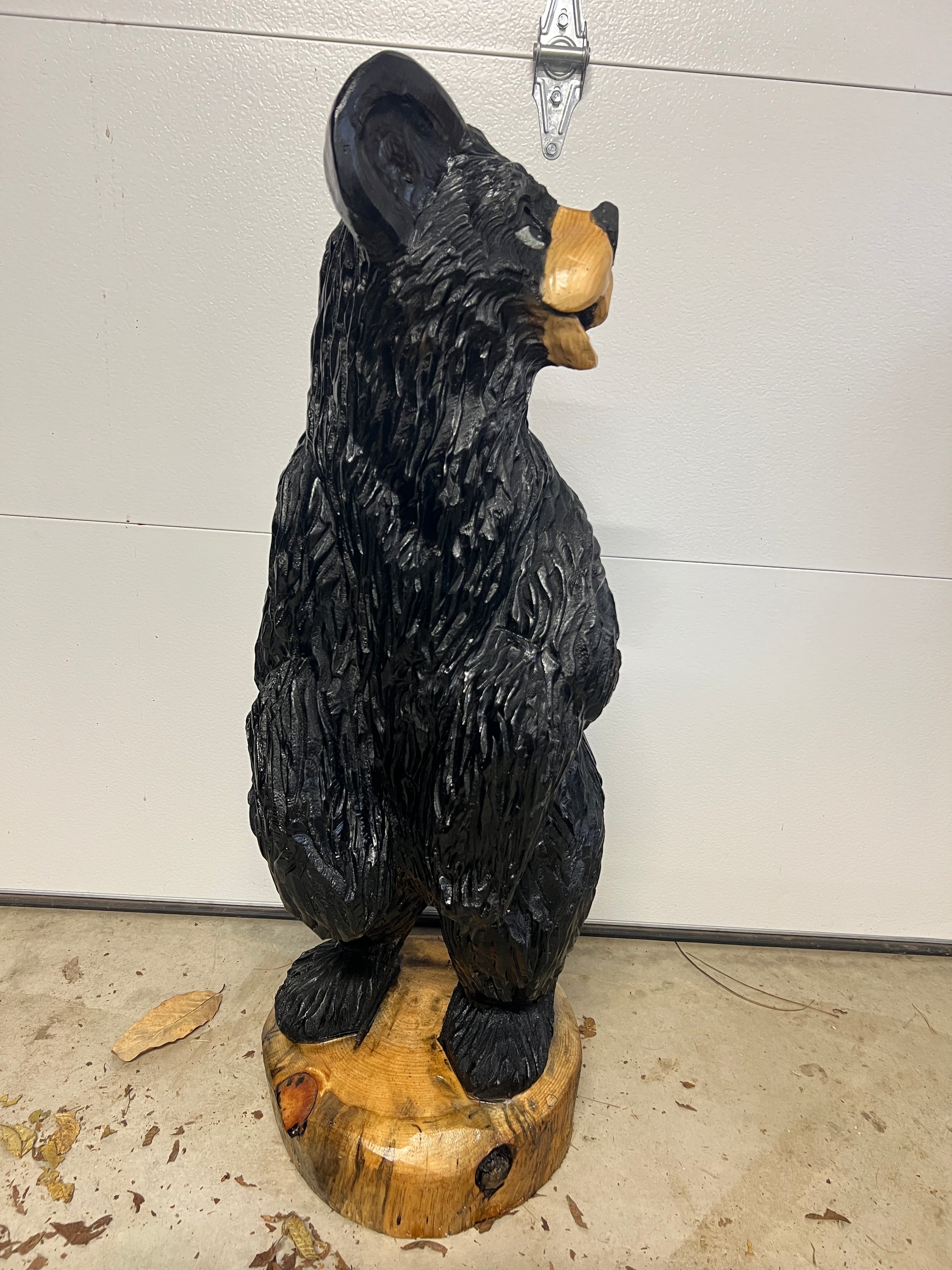 A friendly black bear carved from a single log, finished in deep black with a warm honey muzzle. Textured fur cuts catch the light and the solid round base keeps it sturdy. Perfect porch greeter or cabin centerpiece.