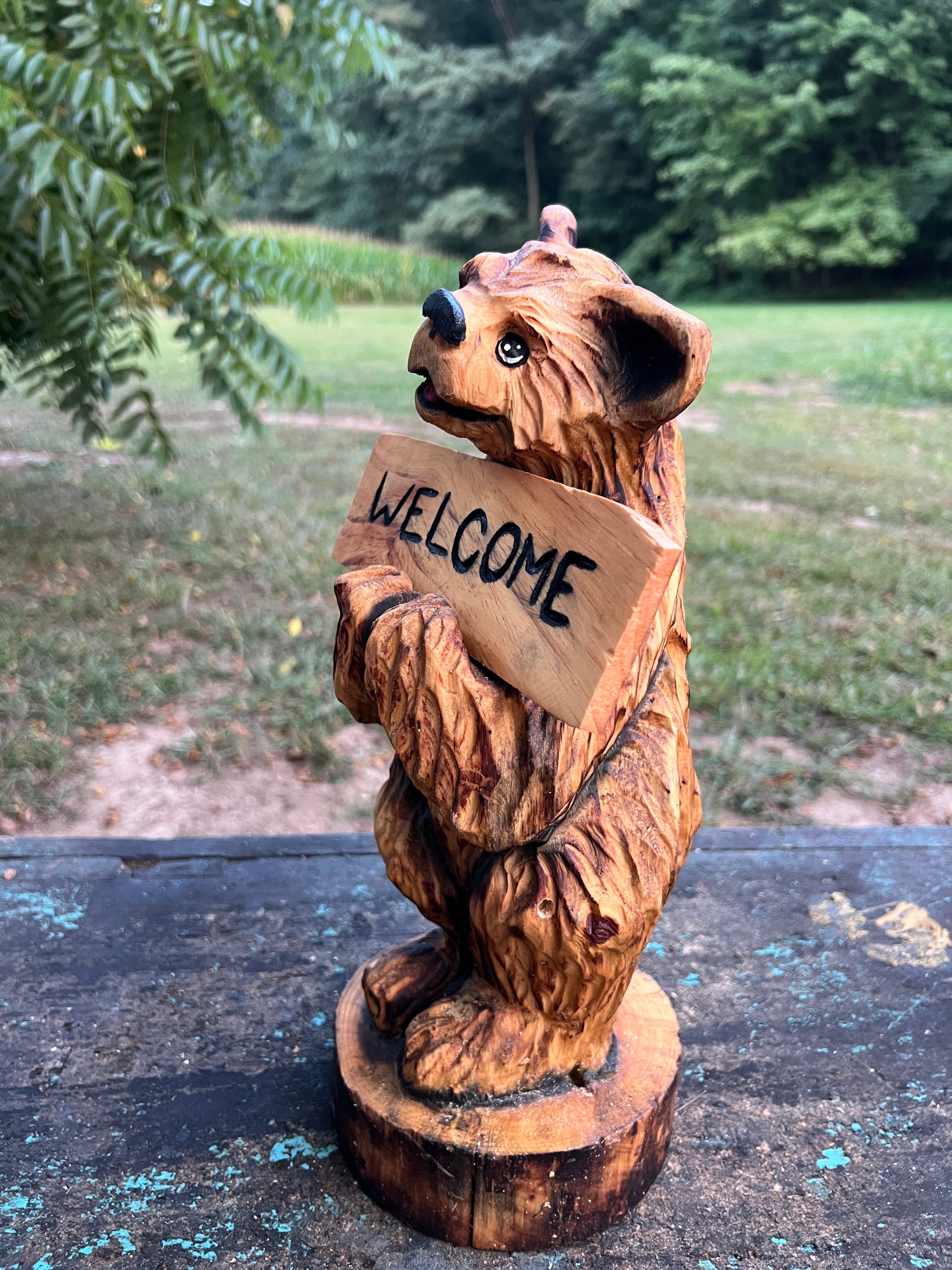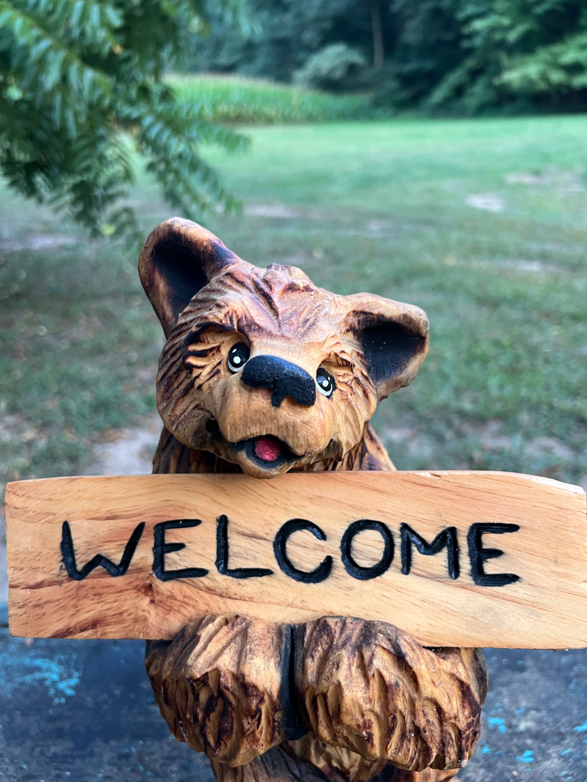 This bear isn't just carved wood; it's a captivating blend of artistry, craftsmanship, and raw talent. Brought to life with the roaring power of a chainsaw and an artist’s keen eye for detail, every bear tells a unique story. Each sculpture is individually hand-carved from genuine wood, carefully sealed for durability, and infused with Jenna’s distinctive creative spirit. No templates, no shortcuts—just authentic skill, sawdust, and passion.