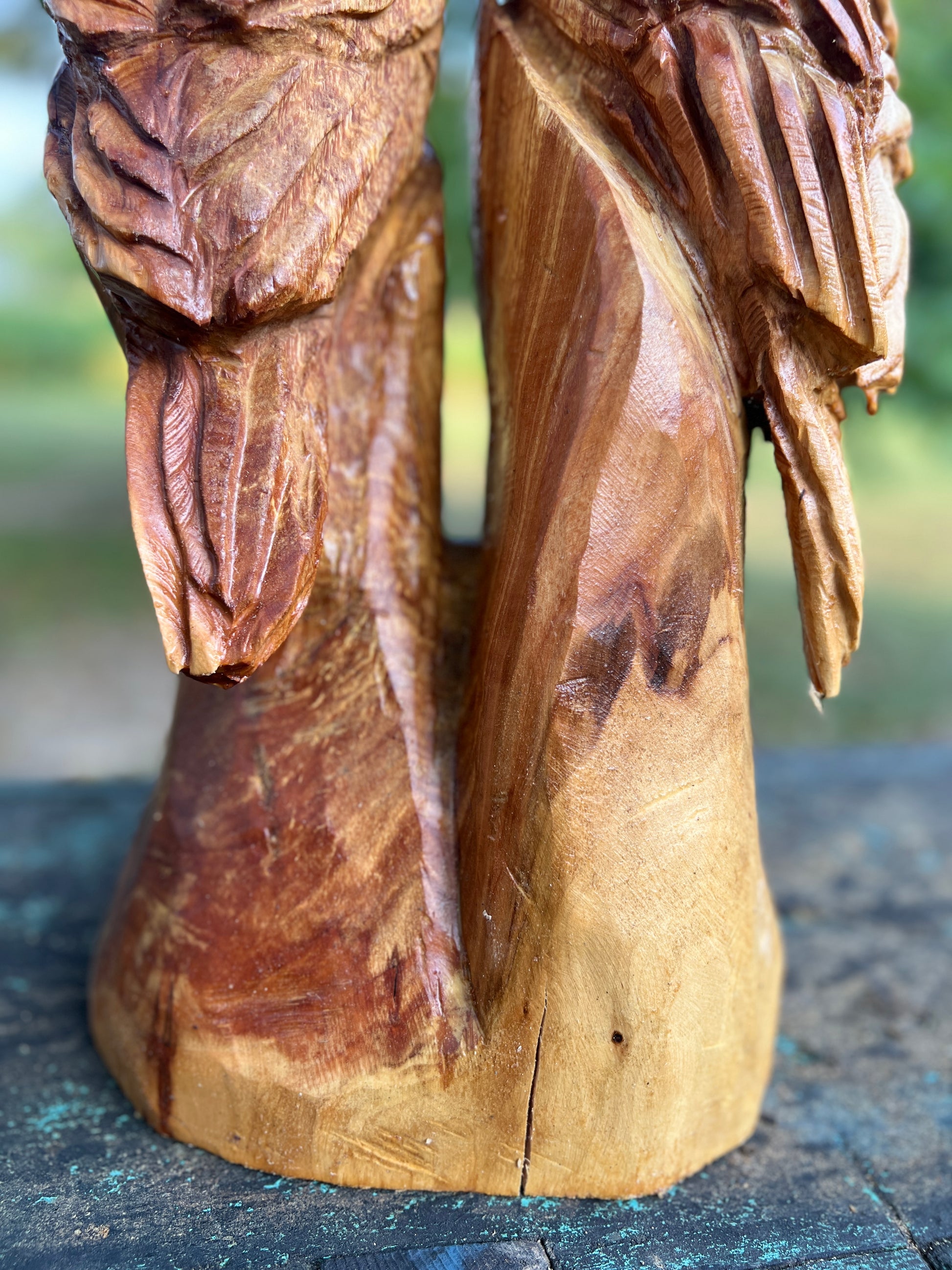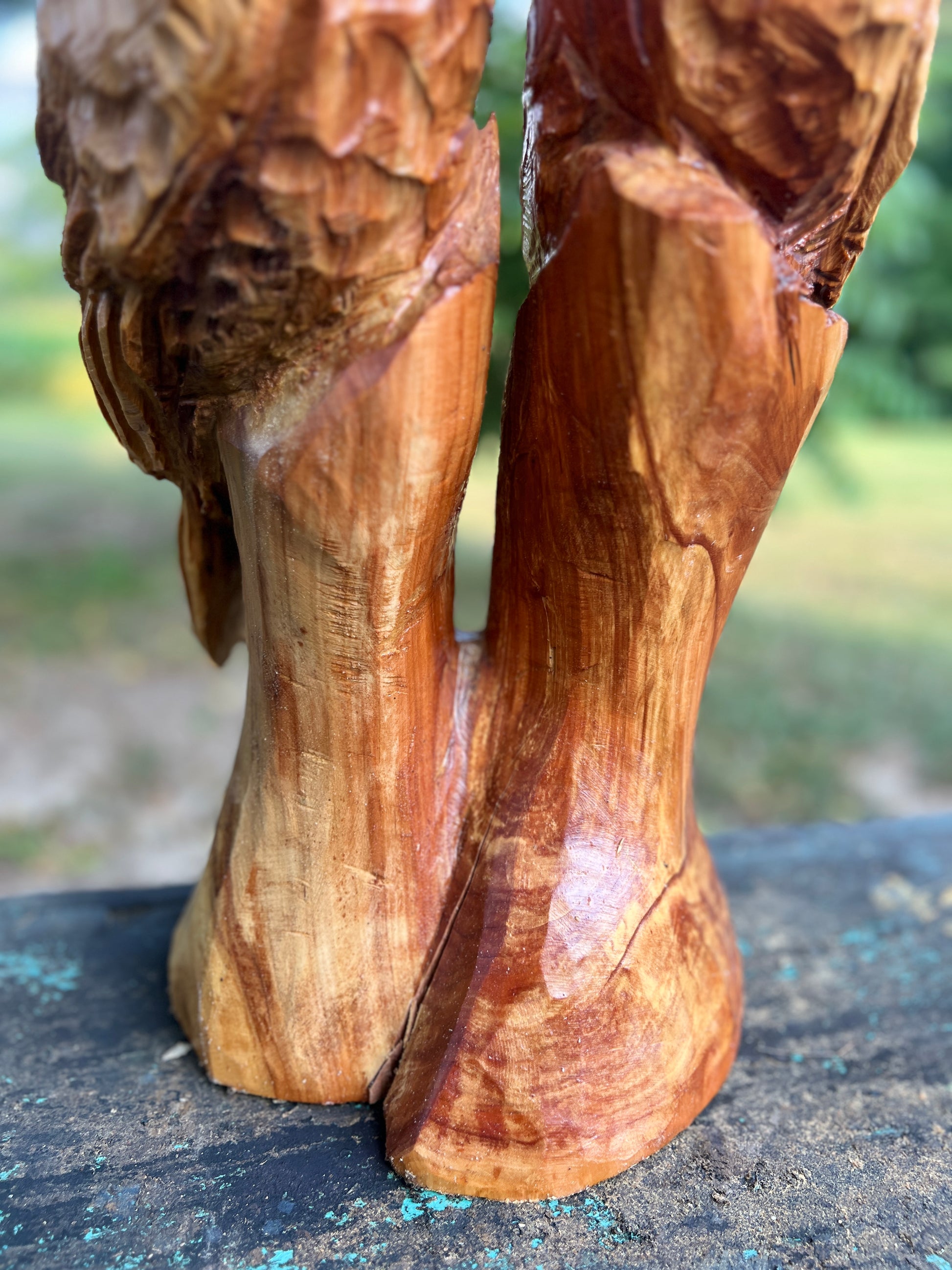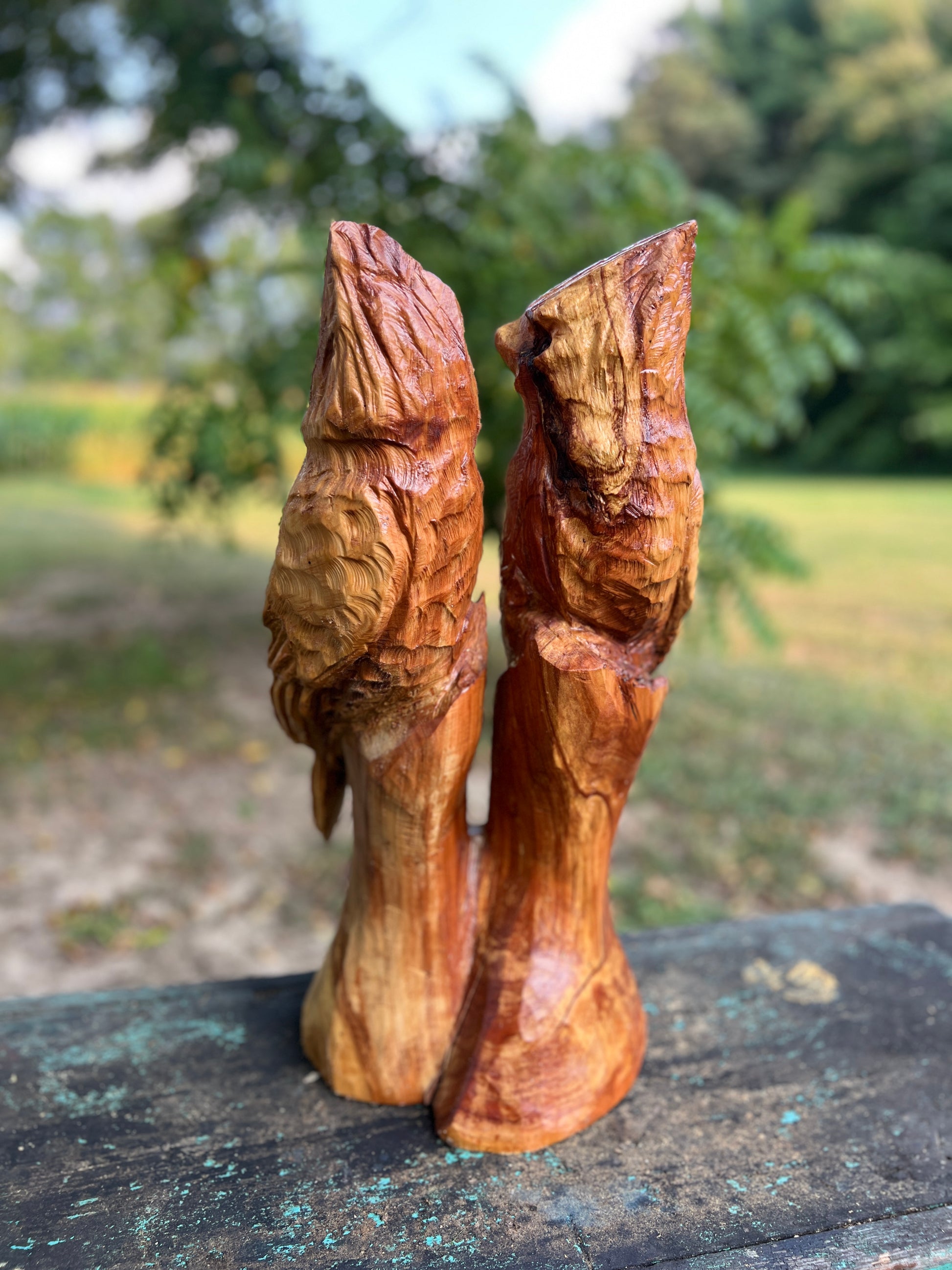 Two cardinals, side by side—brought to life in the natural flow of crab apple wood by ChainsawJenna herself.