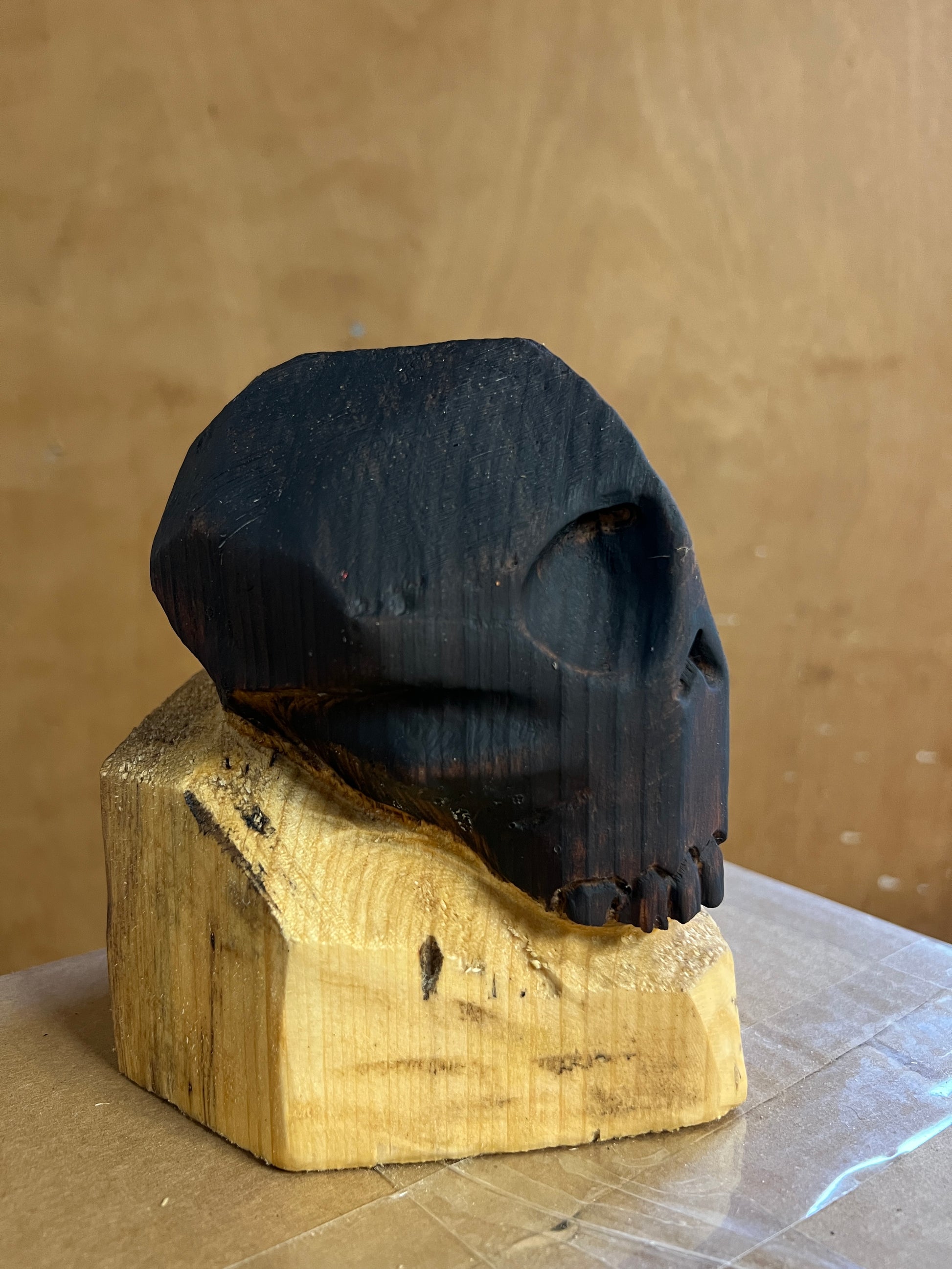 A moody, stylized skull hand-carved from solid wood. Charred to a deep black with warm brown edges that reveal the grain. Compact, gritty, and full of character. Perfect for shelves, desks, and year-round gothic vibes.