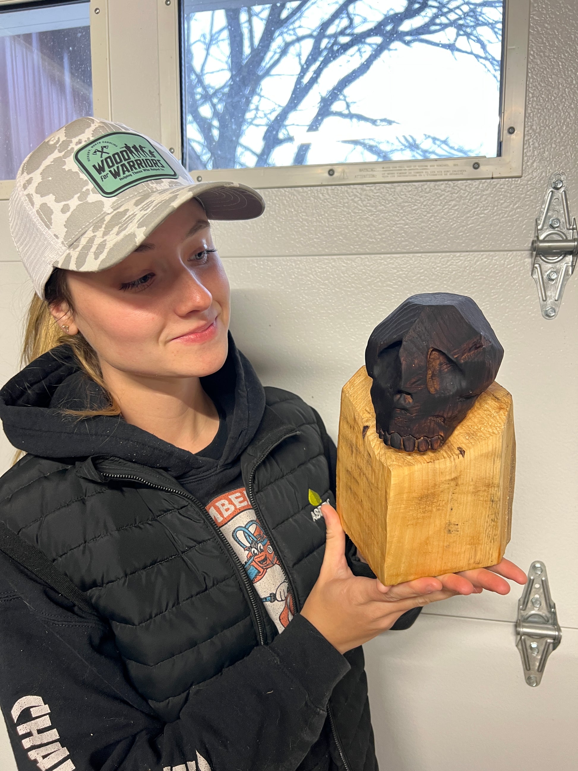 A moody, stylized skull hand-carved from solid wood. Charred to a deep black with warm brown edges that reveal the grain. Compact, gritty, and full of character. Perfect for shelves, desks, and year-round gothic vibes.