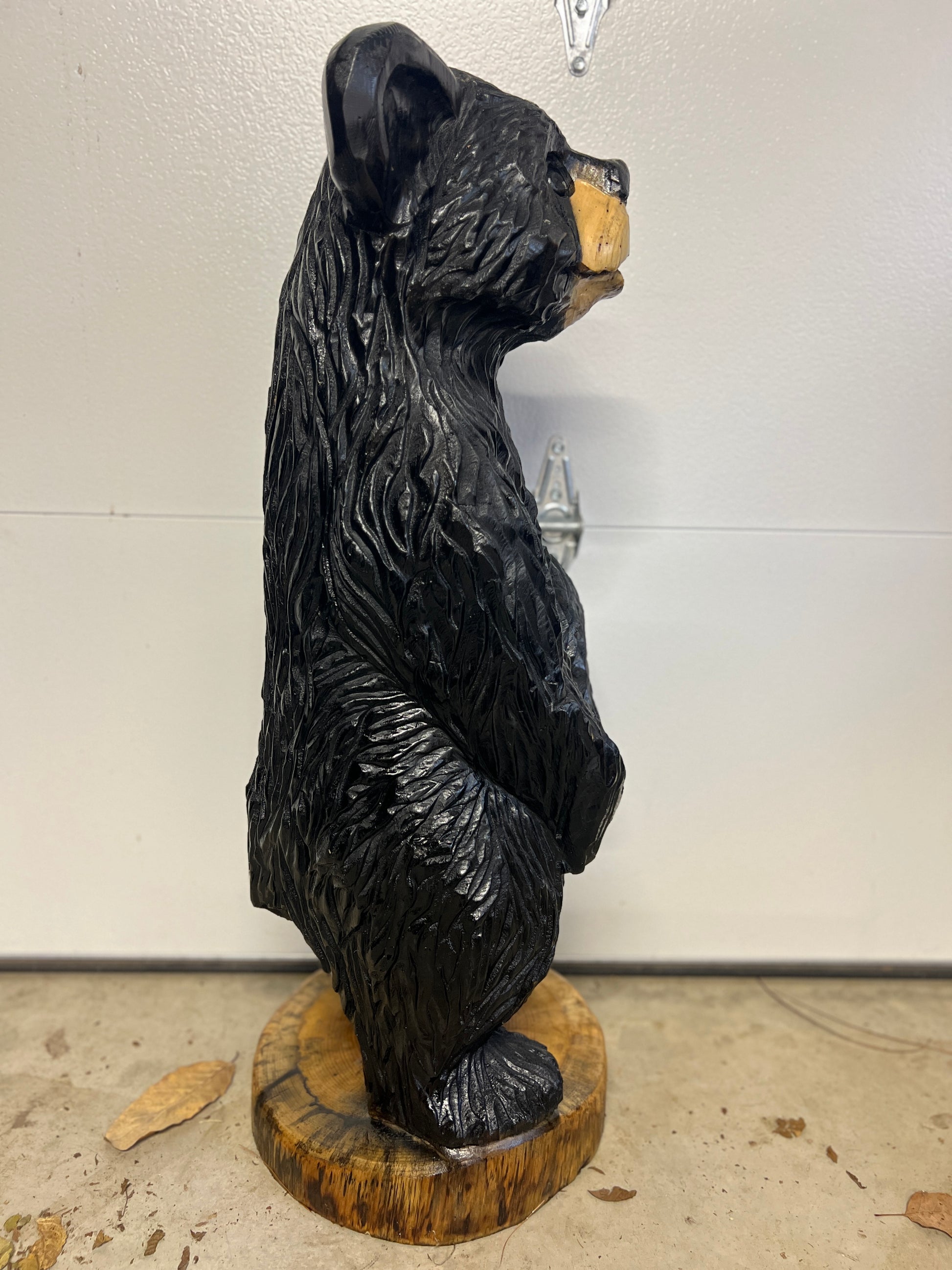 This black bear is carved by hand from solid wood and finished for rich contrast. The fur is deeply textured with clean, directional cuts that create movement. The face has a warm honey brown muzzle and nose that bring the bear to life without losing its rustic charm. It stands on a matching round wood base for a stable, freestanding display.